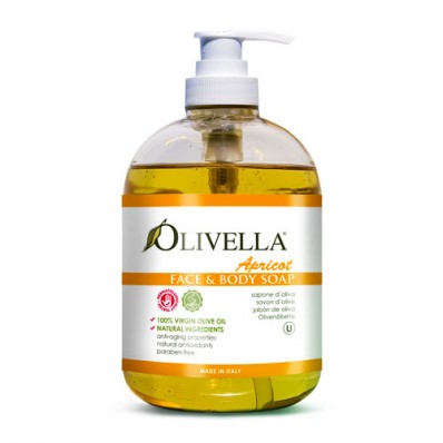 Olivella Apricot, Face and Body Liquid Soap is from 100% virgin olive oil, with the sweet scent of apricots. Our all natural soap hydrates the skin as it cleanses. Great for all skin types. From your first application, you will notice your skin feels softer and your pores super clean. Our patent formula is gentle enough for sensitive skin conditions and therefore all ages from kids to grandparents can enjoy its benefits of concentrated nutrients.